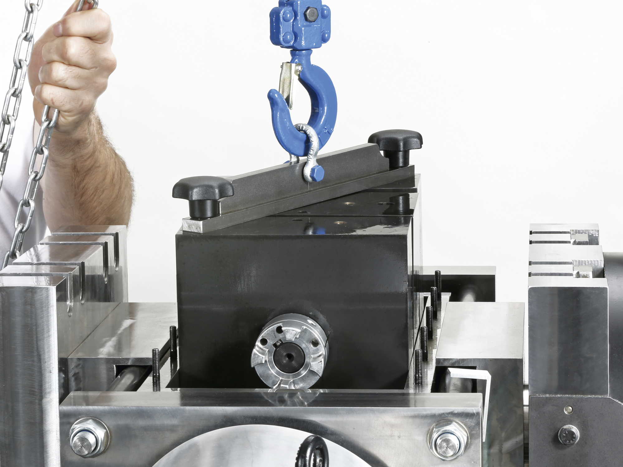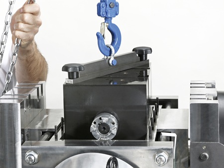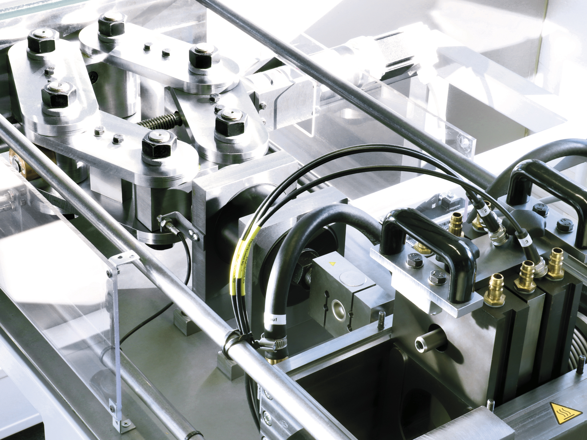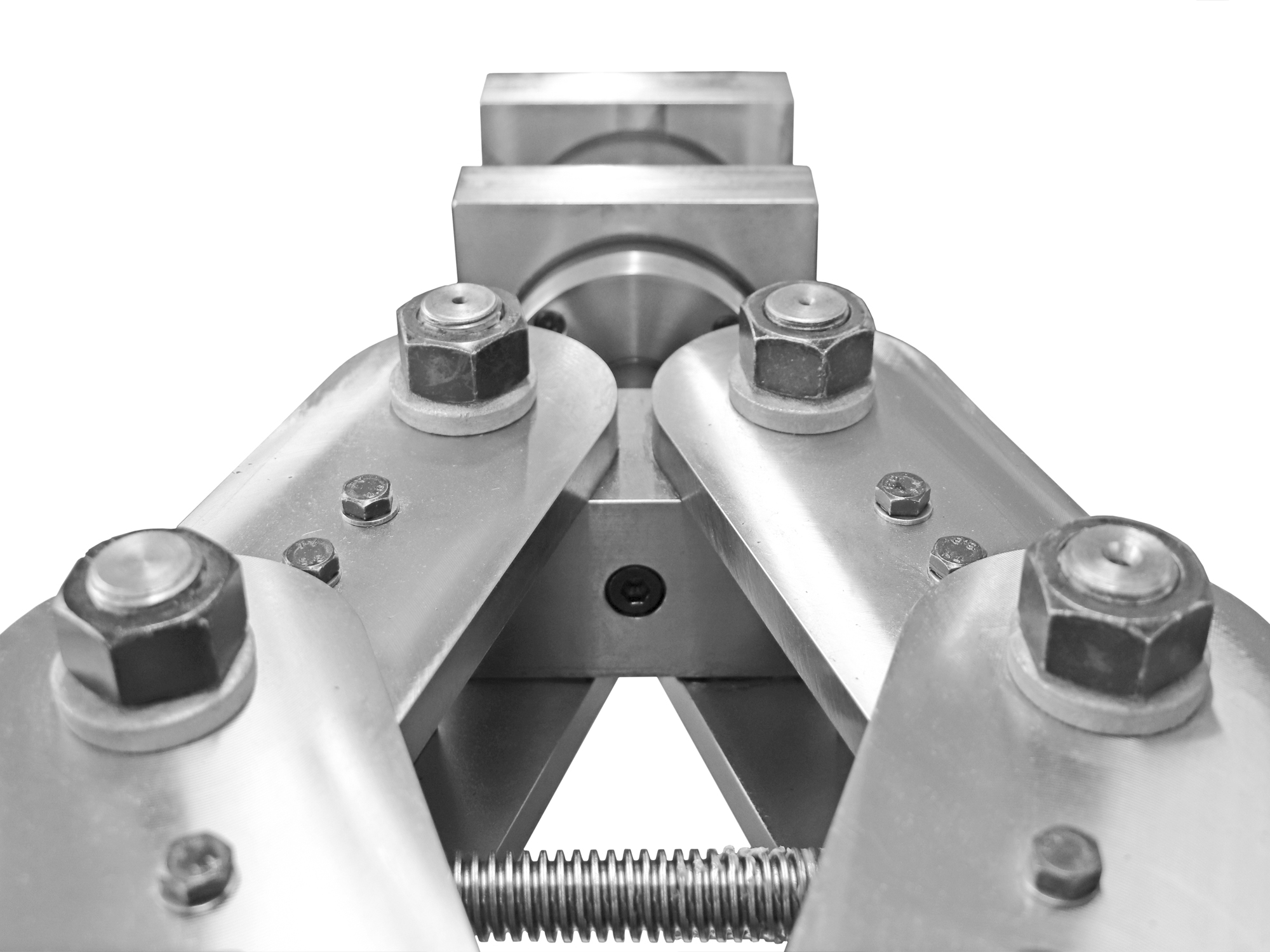 Radial loads of between 300 N and a maximum of 20,000 N must be applied with the small deep groove ball bearings that are utilised. For this reason, a hydraulic cylinder would be unsuitable for this bandwidth with very low deviations during operation. On the bearing test bench WRM 1603, the precise load of the radial bearings is achieved using a toggle linkage. Using the permanent registration of the force via a load transducer, a step motor adjusts the power of the toggle linkage in a highly precise manner, ensuring that the radial force is kept virtually constant.