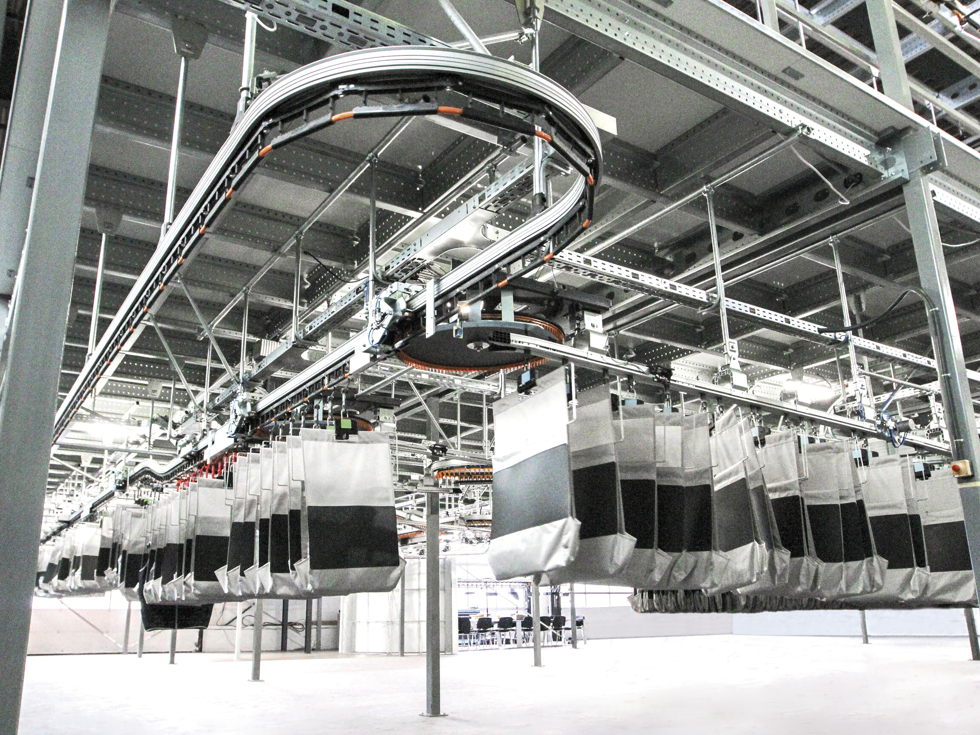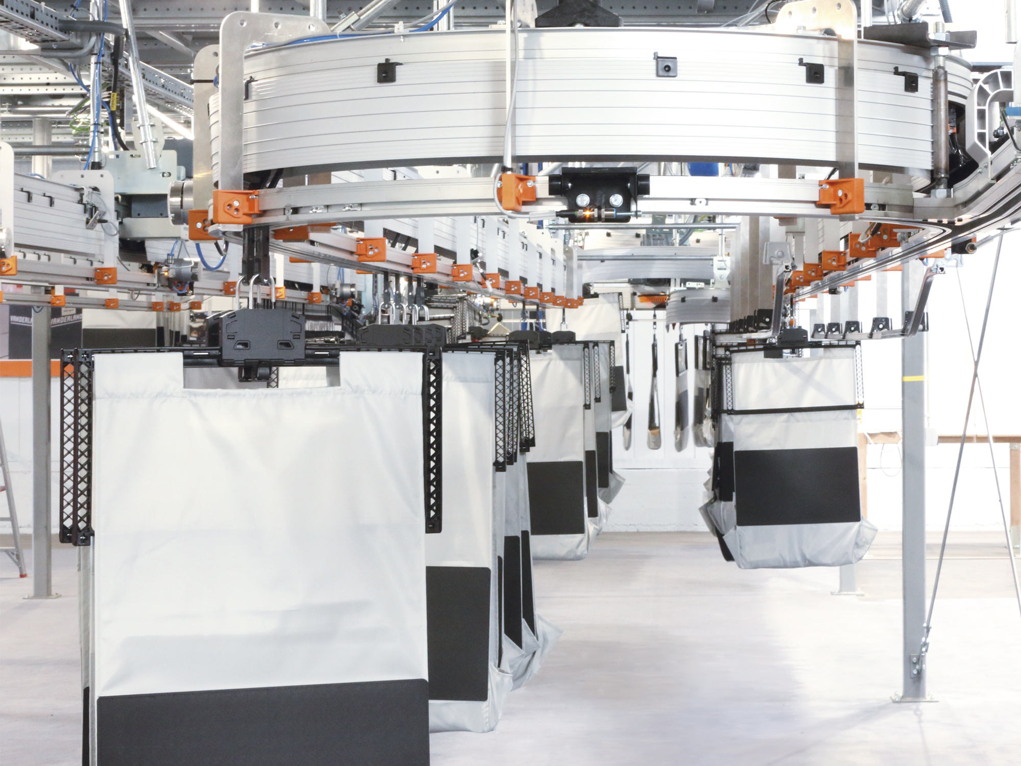 They are controlled via the RFID transponder of the roller adapter to which it is mounted. The bag itself is comprised of polyester fabric, which is reinforced with a plastic panel in the lower section. Special plastic frames provide an improved function during loading and unloading, reduce the volume level of the system and fulfil the following features: They preserve the form of the bags and at the dispatch and packing positions a large insertion opening is created by lifting the frame.