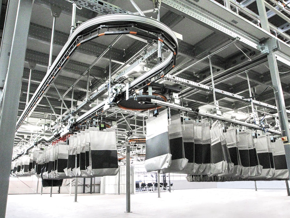 Vengono guidati tramite il transponder RFID dell’adattatore a rulli a cui sono fissati. Le borse stesse sono realizzati in tessuti in poliestere, rinforzati nella parte inferiore tramite una piastra in plastica. Delle finestre in plastica apposite offrono una migliore funzionalità durante il carico e lo scarico, riducono la rumorosità dell’impianto e rispondono a ulteriori caratteristiche. Grazie a esse le borse ottengono la loro forma e in corrispondenza delle postazioni di lavoro e imballaggio si crea con il sollevamento della finestra una grande apertura di introduzione.
